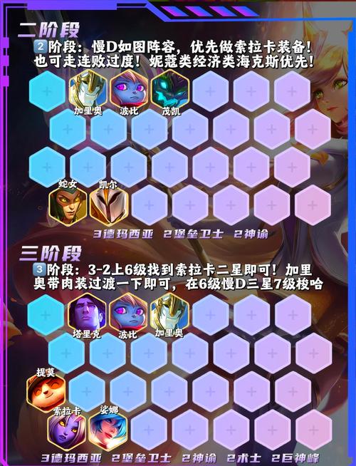 - 早期以鳄鱼和蛇女过渡,利用蛇女携带奶妈装备,鳄鱼携带乌鸦装备。- 注意观察以绪塔尔的格子,合理搭配前排和后排的阵容。中期运营**:- 在2-4阶段选秀时,优先选取与战力相关的海克斯。- 5人口时根据手牌选取合适的英雄过渡,等待奶妈和乌鸦的三星。