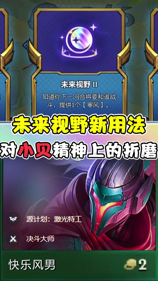 金铲铲未来视野使用方法:右边头像旁边有个红xx的就是下把对战的,灵风吹对方关键人物,c位或者前排。海克斯等级:黄金海克斯。海克斯效果:提供1个灵风/光明灵风。提前预知你下一轮的对手。未来视野太强了、【光明】灵风一直吹对面C位,等对面C位8秒下来后,我金克斯已经起飞,开始收割全场了。
