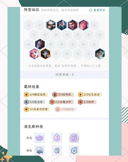 〖Two〗、其他选取:潘朵拉、亮出架势、星界赐福、狩猎律动、直击弱点等均可选取,根据对局情况灵活搭配。综上所述,金铲铲之战名流剑姬阵容以剑姬为核心,搭配3名流羁绊和辅助英雄,通过合理的装备搭配和海克斯强化选取,能够发挥出极高的输出和续航能力,成为一套强势的阵容选取。