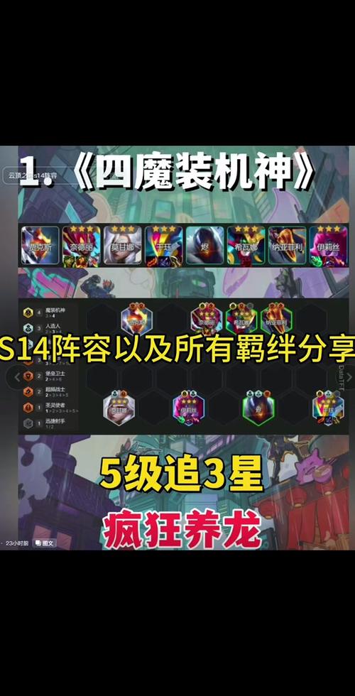 〖Five〗、金铲铲之战S14魔装机神阵容运营指南及稳赢策略:阵容核心与羁绊解析 核心羁绊:4魔装机神:提供强大的群体护盾与沉默控制,核心单位包括豹女、千珏、龙女、蜘蛛。3星之守护:提供群体回血与护盾叠加,可搭配蕾欧娜、拉克丝、悠米。2斗士:作为前排承伤,建议选取龙女与机器人。
