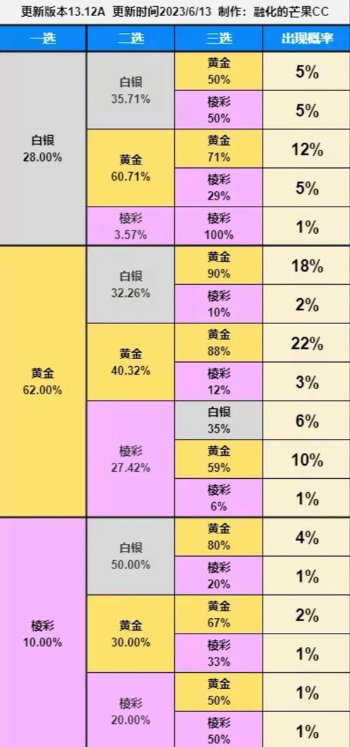 〖Three〗、在金铲铲之战游戏中,银银金的海克斯等级组合出现概率比较高,达到百分之三十。相比之下,彩彩彩的组合出现概率最低,仅有百分之一的机会。游戏中各种海克斯颜色的组合出现概率分布情况如下图所示。图中清晰地展示了不同海克斯颜色组合出现的概率。其中,银色和金色的组合最为常见,而多彩组合则较为稀有。