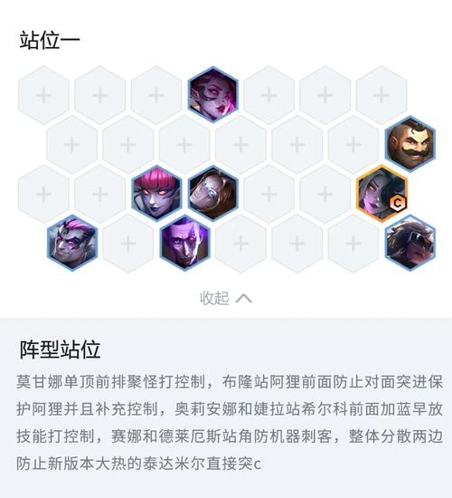 辛迪加刺客阵容由图奇、德莱厄斯、泰隆、卡特琳娜、婕拉、萨科、艾克、布隆和阿卡丽组成。其中,萨科作为核心输出,阿卡丽作为副输出,布隆作为主坦克。过渡策略 开局建议在2-1阶段拉4人口,2-5阶段拉5人口,初期以2刺客、2保镖、2战斗学院为过渡。
