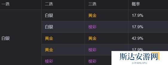 〖Three〗、在金铲铲之战中,银银金的海克斯组合出现概率比较高,达到了30%,而彩彩彩则是最低,仅有1%的几率。通常来说,银色海克斯是最常见的,其次是金色,最后是彩色。具体各色海克斯的出现概率可以通过下图查看。从数据来看,海克斯颜色的出现遵循一定的规律。