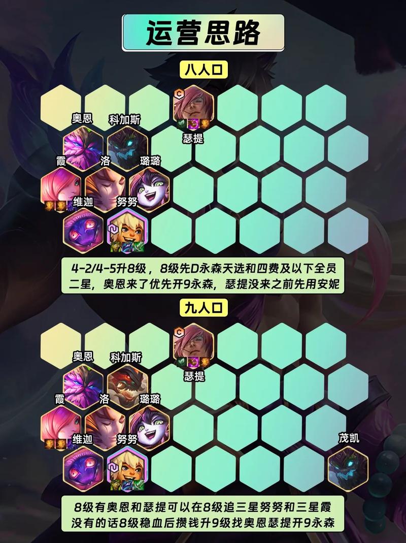 前期最佳组合为龙女+豹子+狼人+杰斯,或斗士狂野过渡。中期:2-5上五人口,基于分裂龙女或日炎连胜,多挂3费拼多多组合。连胜则3-1跳6人口,没连胜则3-2上六人口。后期:连胜则3-5跳7人口,没连胜则4-1上七人口并小D提升阵容质量。