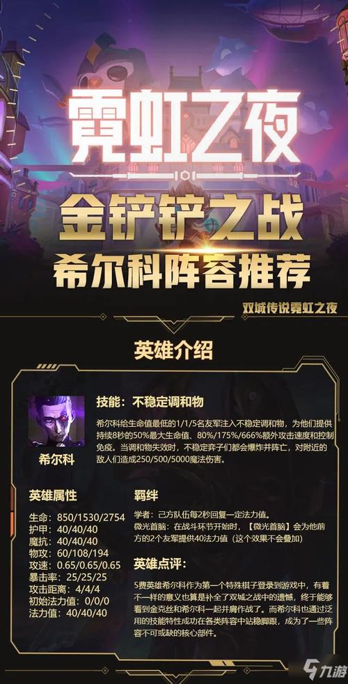 〖Four〗、金铲铲之战霓虹之夜最恶心的阵容是俄洛伊、雷克赛、瑟庄妮、扎克、蔚、烈娜塔、塔姆、维克托、希尔科组成的格斗炼金学者阵容。玩法运营攻略如下: 阵容组成:这个阵容以格斗家和炼金科技为主,搭配学者和执法官等羁绊,形成4格斗3炼金2学者2执法1食神1未来的强大组合。