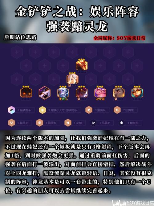 在金铲铲之战s5赛季中,灵魂虹吸阵容是由6黯灵龙、2刺客、2强袭炮手、2重骑兵、1冒险家、1龙神组成。这一阵容不仅在后期输出强大,还能利用黯灵龙的特殊技能进行控制,给对手施加压力。强化符文方面,优先选取灵魂虹吸,这将极大地增强队伍的输出能力。