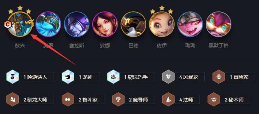 羁绊组成:9星界龙 1龙神 3法师 魔导师 2格斗家 符文选取分析 优先:明智消费 快速思考 星间赠礼 次选:dd街区 阿福的百宝袋1 法师之冕 分析:直击弱点:这个巨龙圣坛在这套阵容里收益极高,阵容里奥拉夫、永恩、赛芬都是物理输出伤害,当对面没有出护甲装备时就像切菜一样。