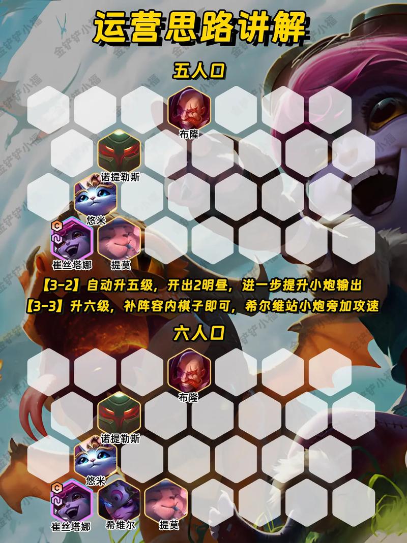 阵容组成:猪妹、蜘蛛、剑魔、豹女、小炮、泰坦、日女、锤石 天选法师 小炮的阵容属于重装羁绊,8人口就能直接上一个重装4法,可以让小炮的输出更暴力。阵容运营:这是一套运营阵容,如果想快速上9,一定不要停留在7人口,否则会很容易搜不到天选,必须要在7人口D卡,保证阵容的强度。