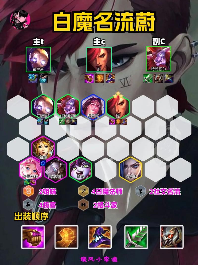 〖Four〗、阵容组成:莫甘娜、璐璐、艾希、婕拉、烬、赛娜、奥利安娜、烈娜塔。阵容羁绊:4白魔、3辛迪加、2狙神、2学者、2精密、1社交名流。海克斯强化推荐:狙神之巢、白法银、炽热香炉、方阵、翠绿面纱、锻炉、光辉。装备搭配:主C莫甘娜:石像鬼板甲、水银、兹若特传送门。