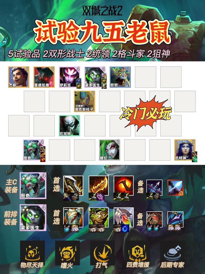 玩法简析中,连胜是九五至尊阵容的核心策略。过渡阶段,推荐使用豹女三国天选+皇子+蜘蛛+提莫的组合,以3三国2神盾2神射为过渡阵容。根据棋子质量,适时提升人口等级,保持阵容的战斗力。在前中期,过渡阵容的选取并不唯一,根据棋子质量灵活调整。