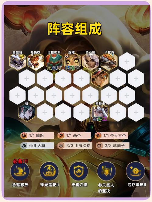 〖Six〗、阵容搭配 羁绊核心:4灵能+4星守。这套阵容搭配的羁绊核心是4灵能+4星守,灵能使羁绊在季中赛季变化不大,而星之守护者羁绊从3579变为了2468,4羁绊下星守棋子能在战斗中多获得70%法力值,这让星守搭配变得更灵活。主C妮蔻装备 推荐装备:朔极之矛+珠光护手+破防者。