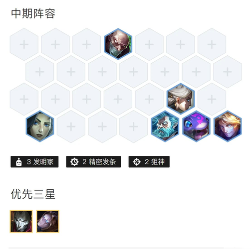 金铲铲之战狙神推荐玩【保镖狙神】4狙神2保镖2白魔,具体攻略如下:棋子及羁绊如图所示:装备分析开局抢手套,攻速,大剑,优先烬的装备,其次赏金的装备,防装给布隆。烬如果没水银,也可以做个伏击给发条。