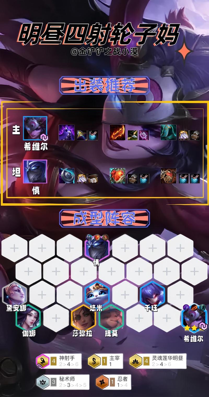 〖Two〗、阵容组成 该阵容由以下英雄组成:影流之主-劫、痛苦之拥-伊芙琳(寡妇)、影流之镰-凯隐、迅捷斥候-提莫、魔法猫咪-悠米、永猎双子-千珏、九尾妖狐-阿狸、时光守护者-基兰。羁绊组合为4夜影、4灵魂莲华明昼、2秘术师、1天煞、1忍者。装备选取 主C劫:必备装备:火炮、水银。