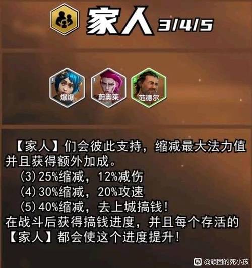 《金铲铲之战》S13赛季“家人”羁绊效果如下:羁绊组成 棋子成员:爆爆、蔚奥莱、范德尔。羁绊效果 『3』家人:当场上存在3个“家人”羁绊棋子时,他们会彼此支持,缩减最大法力值25%,并获得12%的伤害减免。这意味着“家人”羁绊的棋子们能更快地释放技能,并且在战斗中更加耐打。