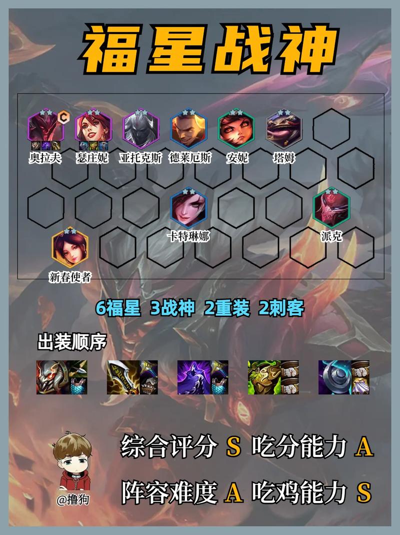 〖Three〗、天选福星转战神九五 阵容组成:塔姆、安妮、猪妹、德莱厄斯、卡特、奥拉夫、派克、亚托克斯、基兰。核心装备:主C奥拉夫搭配羊刀、火炮、巨杀;副C德莱厄斯搭配正义、无尽、法爆;主T猪妹搭配板甲、狂徒、龙牙。阵容特点:非常强力,但要求有天选福星才能组成福星九五大成。