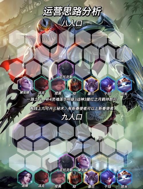 〖One〗、运营方面,开局找福星天选,如塔姆或斗士塔姆。连败到6或7人口时,根据选秀情况选取主C装备,保持连败获取金币。5人口后,观察对手质量调整阵容。后期7人口可追三星诺手或法系装备,8人口则找猪妹和三星主C,9人口补上基兰和猩红羁绊,保持高战力。最后,享受拉10上10费卡吃鸡的时光。