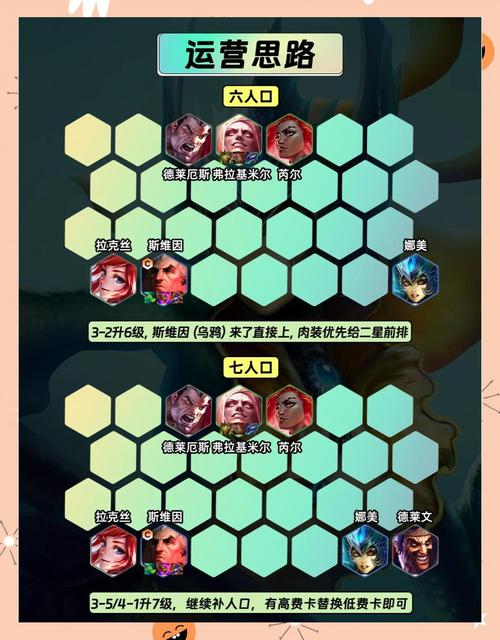 〖Three〗、运营攻略:- 前期:选秀拿短弓或拳套,2-1上4人口,2-5上5人口,组成4海克斯2格斗2强袭,优先做希维尔的装备,尽可能打连胜。- 中期:3-2拉6人口,小D提质量,比较好整体能2星。4-1拉7人口,看质量决定是否继续上8。- 后期:4-5升8人口,看情况是8人口梭哈还是存钱上9人口。