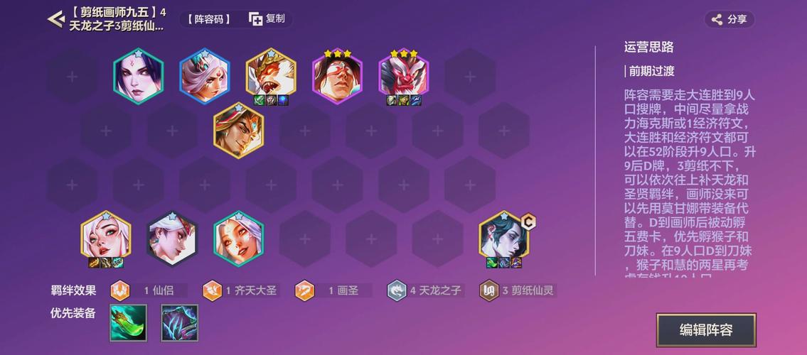 骑士天使阵容 预测构成:以骑士羁绊提供坦度,天使作为核心输出点,搭配其他辅助英雄。预测特点:坦度和输出兼备,后期能力强,适合喜欢稳健打法的玩家。以上阵容仅供借鉴,具体搭配还需根据游戏内的实际情况和对手阵容进行调整。