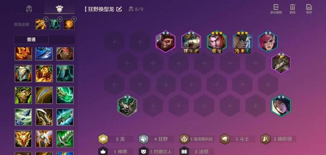 〖Three〗、阵容搭配方面,推荐的英雄羁绊组合包括逆血战姬(龙女)、狻猊之心(纳尔)、悟空(猴子)、南天之怒(狼人)、星界龙神(龙王)、皮城执法官(蔚)、虚空恐惧(大虫子)、西斗之飒(豹子)。具体分配为2龙、4狂野、3换形师与4斗士。