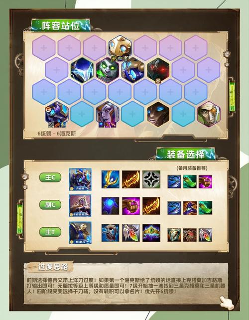核心英雄选取与装备推荐 德莱文:作为阵容的输出核心,德莱文的技能“旋风斩”能造成高额伤害,并提升攻击力。装备上,优先选取无尽之刃提高暴击伤害,饮血剑提供续航能力,巨人杀手则用于应对高护甲敌人。羁绊选取 监察使:为队伍中的刺客提供额外的攻速加成,非常适合德莱文这种依赖普攻输出的英雄。