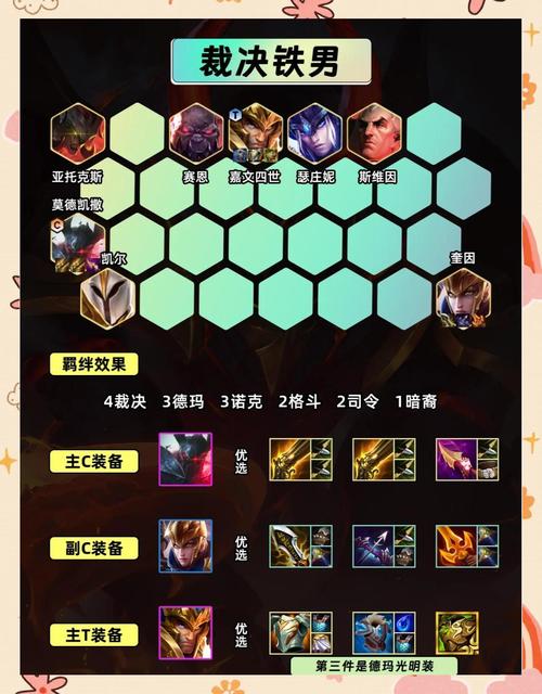 〖Four〗、前期:大剑开局,合成无尽或饮血剑作为打工装备。中期:找到乌鸦的鬼书和冰甲,保证重伤效果和坦度。后期:补充尼拉的输出装备,如果男枪先二星,也可以将装备先给男枪,后续多余输出装备给狮子狗。阵容站位与运营节奏:站位:根据敌方阵容调整站位,确保刺客英雄能够切入敌方后排。
