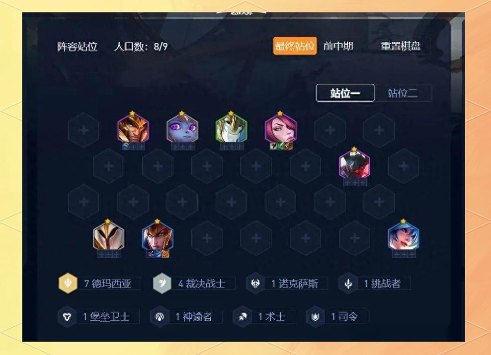 〖Two〗、金铲铲之战s5暴扣诺手阵容玩法攻略如下:装备选取 核心装备:正义、暗夜收割者、狂徒、冰甲、破甲。其中,德莱厄斯的装备需要优先保证。 装备分配:确保德莱厄斯拥有足够的输出和生存能力,正义和暗夜收割者提供伤害加成,狂徒增加生命值,冰甲提供防御和控制效果,破甲则帮助穿透敌人护甲。