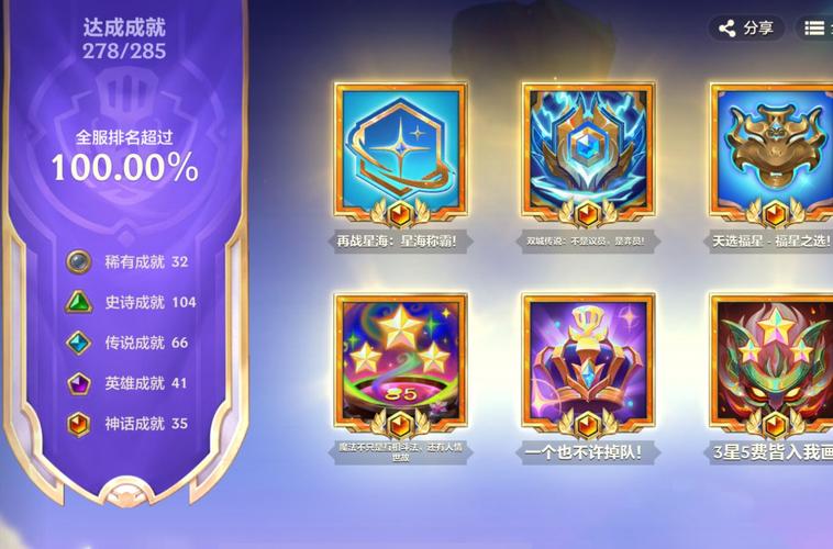 金闪闪的快乐:单人排位上阵3星橙卡并夺冠(紫色成就)。 多多益善:匹配/排位模式满员夺冠(紫色成就)。 保留容错:排位模式130点血量夺冠(紫色成就)。 满血第一:排位模式100点血量夺冠(紫色成就)。 快乐传递:双人模式给队友传3星橙卡(紫色成就)。