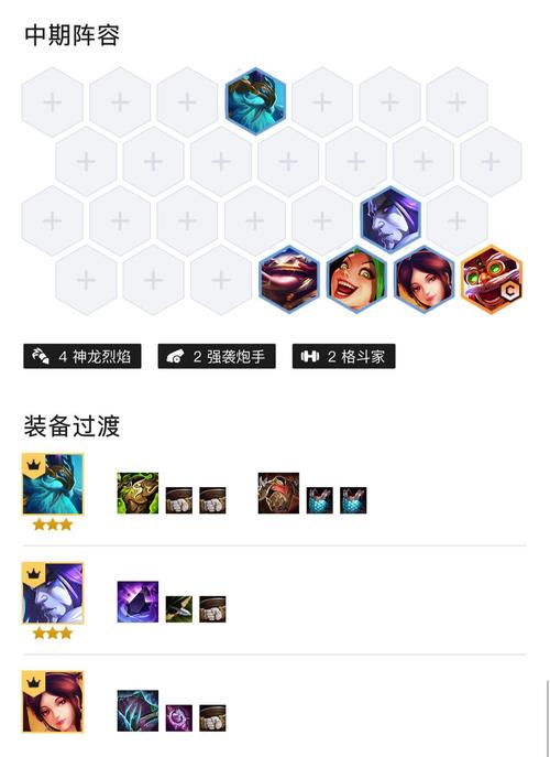 〖Six〗、尽快积累经济并寻找大嘴的装备,羊刀为最优选取。中期过渡:打完石头人后,大D一波,尽量找到三星大嘴。三星大嘴是阵容成型的关键。后期发展:大嘴三星后,可以开始攒钱并拉人口,增加阵容的深度和广度,提升整体战斗力。上面就是金铲铲之战s14战地机甲阵容的搭配推荐,希望对广大玩家有所帮助。