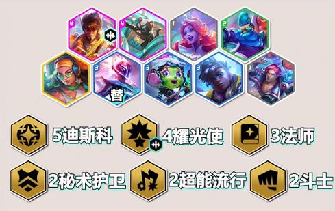 阵容介绍 核心羁绊:主要玩的是3/4/5迪斯科与4耀光使羁绊的崔斯特。 阵容效果:迪斯科羁绊能提升友方普攻效率和续航;4耀光使羁绊大幅降低敌方输出并提升友方输出强度。 关键棋子:主C崔斯特,技能能造成高额魔法伤害并削减敌方魔抗;副C吉格斯,技能能造成魔法伤害并降低敌方魔抗。