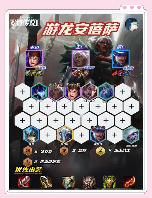 〖Two〗、阵容组成 金铲铲之战中的龙族阵容主要由乌迪尔、瑟提、艾希、婕拉、加里奥和黑默丁格六颗棋子组成。这个阵容的核心是利用龙族的羁绊效果,在每个对抗环节生成龙蛋,通过孵化龙蛋来获取额外的经济和装备奖励。装备选取 主要输出装备:给黑默丁格装备鬼索的狂暴之刃、正义之手和水银。