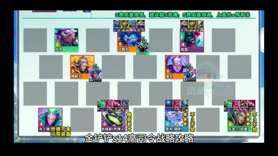 《金铲铲之战》S14司令超频玩法攻略 阵容构筑:核心英雄:艾克、悠米、妮蔻、吉格斯、安妮、盖伦、佛耶戈、莎弥拉、可酷伯(波比作为下位替代,佛耶戈下位替代为铁男,莎弥拉下位替代为火男)。羁绊构成:4战略分析师和3超频战士。站位:妮蔻和可酷伯站在前排,装备肉装以吸收伤害。盖伦和佛耶戈站在他们后面,提供输出和控制。