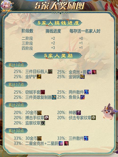 飞升+短兵之利+逆风斗志+浪人+应急护甲:这个组合适合后期、偏肉以及前排多的阵容。飞升的效果需要等待15秒才能发挥最大作用,因此选取能够抗住前期压力的阵容是关键。短兵之利和逆风斗志能够提升前排英雄的输出能力,浪人和应急护甲则提供额外的生存能力。