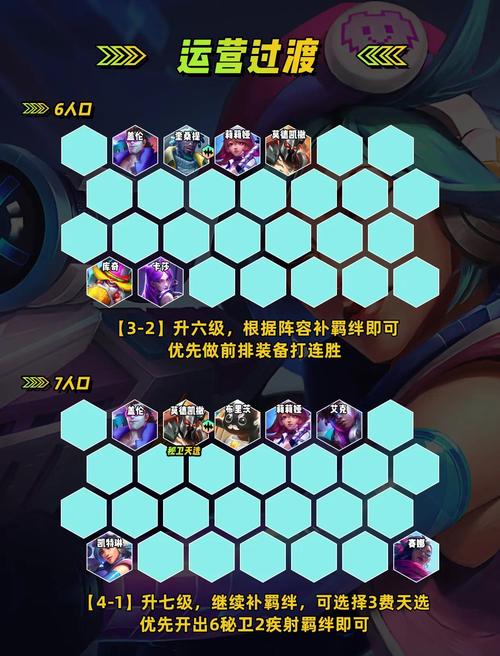 核心羁绊:护卫、裁决使关键英雄:4费卡阿卡丽:羁绊KDA/真实伤害裁决使,技能提供持续伤害与回复,是护卫裁决阵容的核心输出。4费卡布里茨:羁绊迪斯科秘书/护卫,技能提供群体控制与增益效果,增强阵容的团战能力。其他护卫英雄:如波比、潘森等,提供坚实的前排坦度。