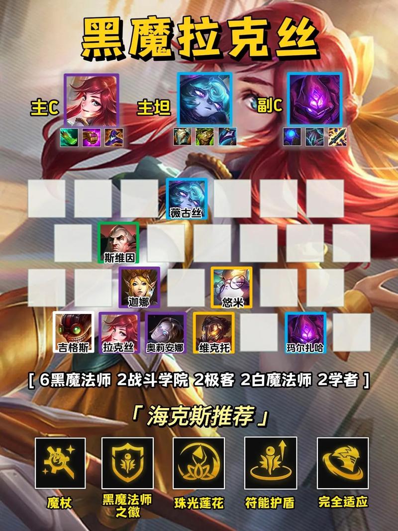 〖Five〗、阵容一:战斗学院永恩 组成角色:青钢影、曙光、布隆、永恩、拉克丝、发条、风女、猫咪、金克丝 装备建议:永恩优先考虑羊刀、饮血、水银,若不理想也可选取正义、泰坦、锋刃。曙光以常规肉装为主,拉克丝则需考虑法术装备。