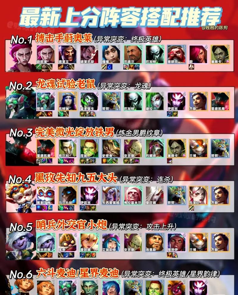 〖Six〗、极客九五阵容 核心思路:利用极客羁绊快速获取装备和经济优势,后期转型为九五至尊(即9人口全2星高费卡阵容)以碾压对手。关键英雄:吉格斯、维克托、金克丝等极客英雄,以及杰斯、塔姆等5费卡作为后期补充。装备推荐:优先合成无尽之刃、蓝霸符等提升输出能力的装备。