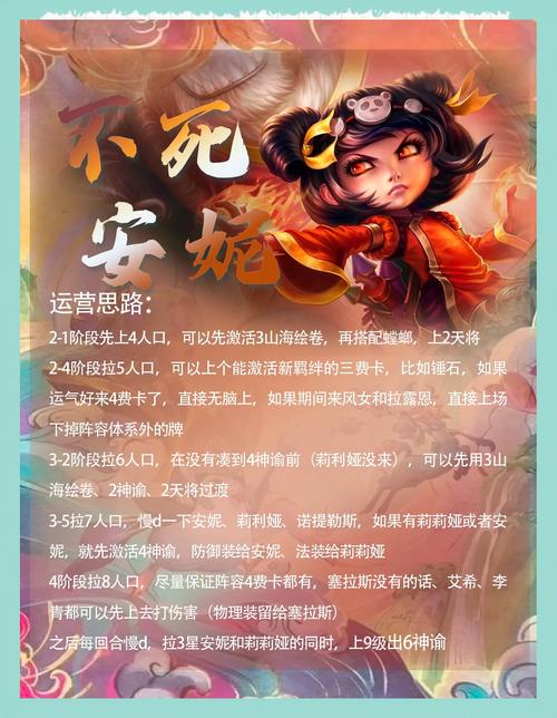 开局抢装:优先抢无用大棒,优先做安妮的科技枪。前期运营:尽量走连胜或连败,2-1拉2-5拉3-1或3-2拉6,6人口之前不要搜卡,优先做安妮的装备。中期过渡:6人口攒30-40块钱用利息慢D三星安妮,同时关注乐芙兰和佐伊的数量,决定副C人选。