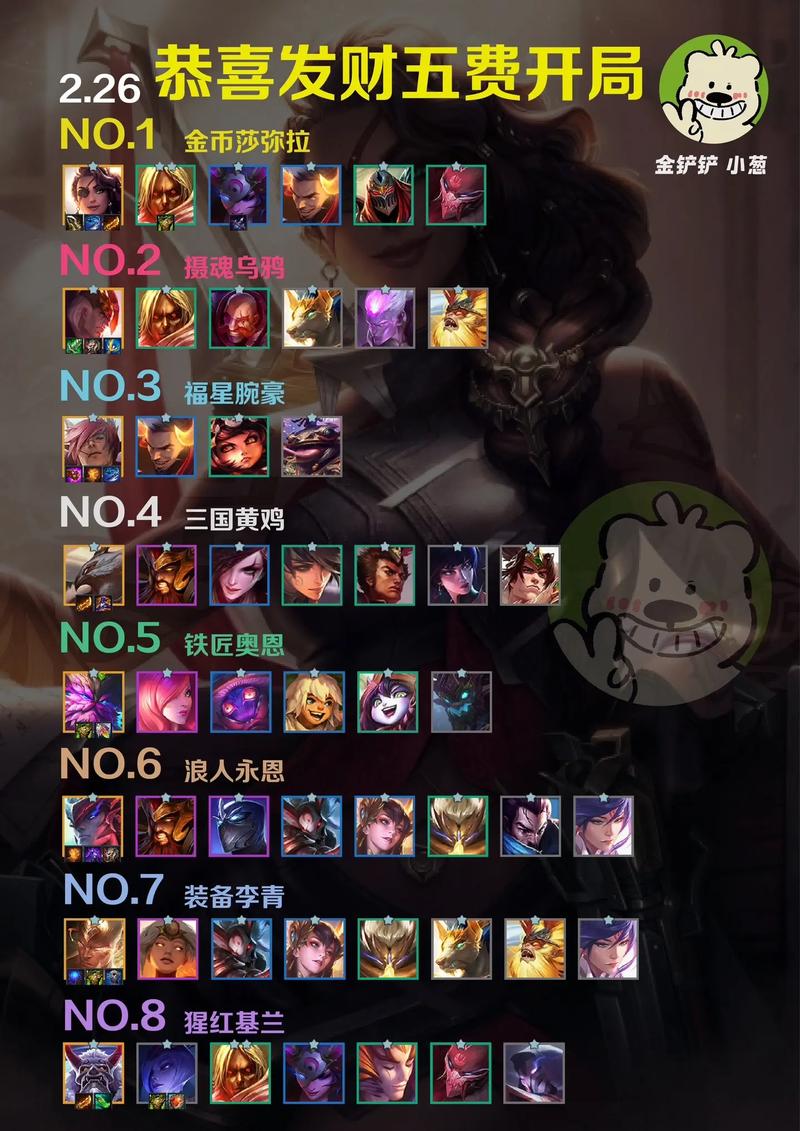 我们可以凑个小羁绊比如两风暴,两神龙,在前期用来过度非常的平滑,而且只需要三个人口即可成型:腕豪,瞎子,ez。我们需要合理的利用每个英雄的羁绊凑成更加强大的战力来赢得游戏胜利。首先我们需要根据我们想要的玩的阵容来找到打工牌去过度。比如说我们要玩冒险家。