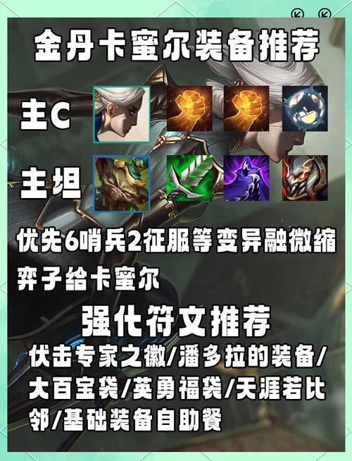 主C德莱文:必备装备:AI程序转职(负极斗篷+金铲铲)、无尽之刃(暴风大剑+拳套)、饮血剑(负极斗篷+暴风大剑)。备选装备:科技枪、正义、轻语(可替换无尽)。副C卡蜜尔:推荐装备:泰坦的坚决(锁子甲+反曲弓)、最后的轻语(反曲弓+拳套)、饮血剑(暴风大剑+负极斗篷)。