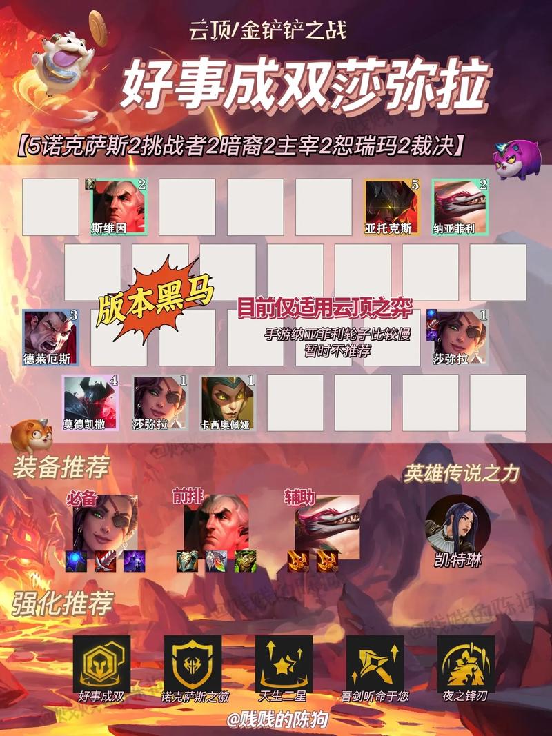 核心思路:以诺姆希为核心的D卡流阵容,通过高冒险羁绊提升诺姆希的属性。装备选取:主C黑默丁格:圣杯是关键装备,尽量多做圣杯以提升蛙妃的伤害。推荐装备为圣杯+圣杯+圣杯。主坦瑟庄妮:推荐装备为日炎斗篷+离子火花+石像鬼石板甲,提升坦度和控制能力。