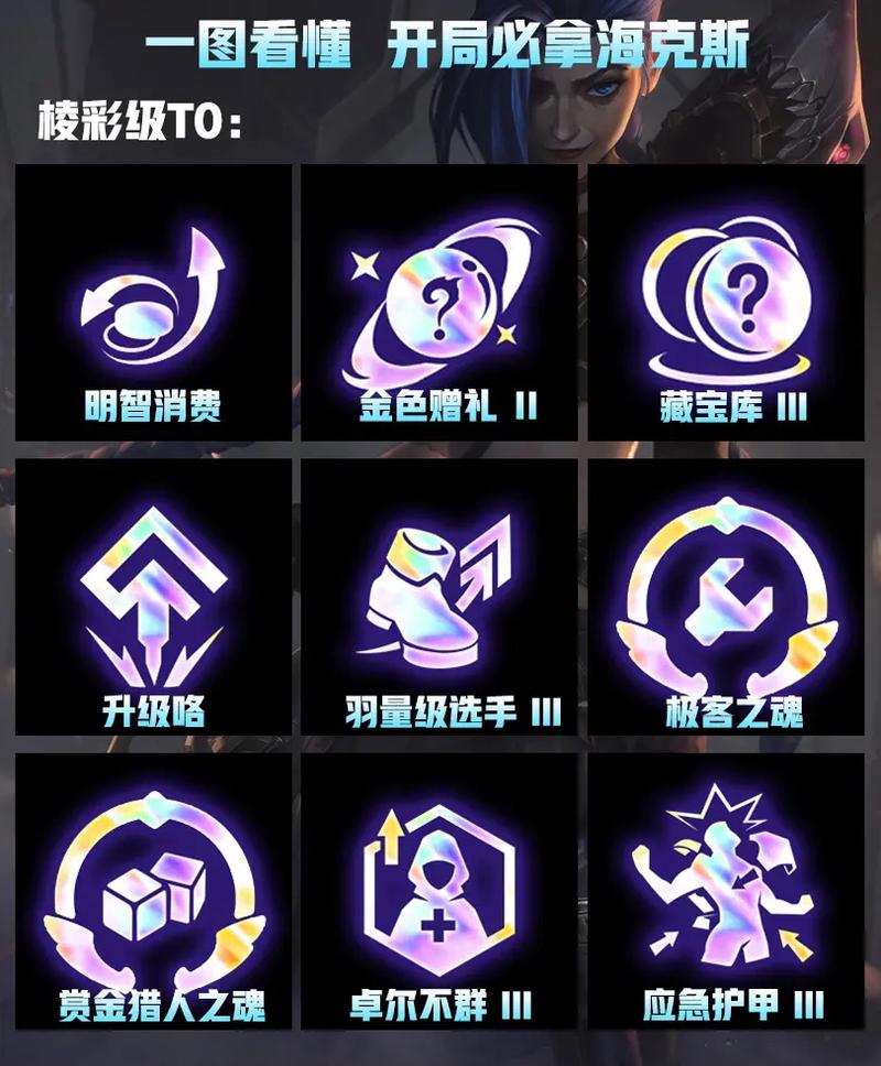 〖Four〗、银色海克斯:以眼睛还眼、成群结队、运力不足、百宝袋等。金色海克斯:极客宝藏之顶、伏击之徽、羁绊:重新联合(艾克+蔚)等。彩色海克斯:战争财宝、活体锻造、混沌召唤、珍藏财宝等。