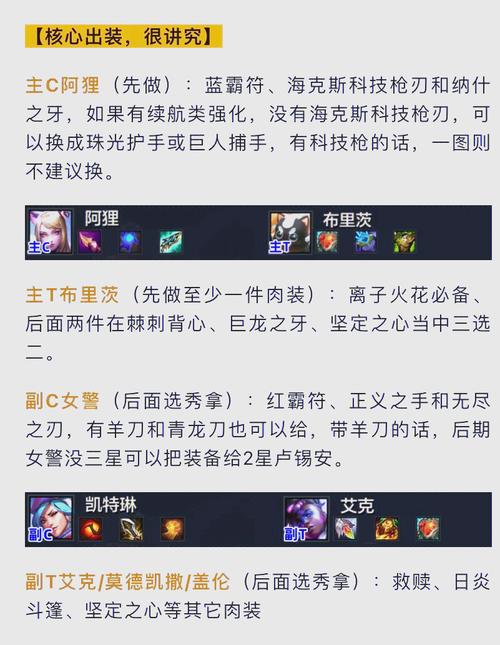 装备推荐:根据主C不同,选取相应的输出装备,如阿狸的蓝霸符+纳什/红霸符+海克斯科技枪刃,伊泽瑞尔的无尽之刃+红霸符+蓝霸符等。主坦扎克则推荐坚定之心+卫冕/圣盾使的誓约+日炎等装备。符文推荐:大到不能倒、辅助宝库、激昂墓志铭、联合抵抗、珠光莲花等符文均可考虑。