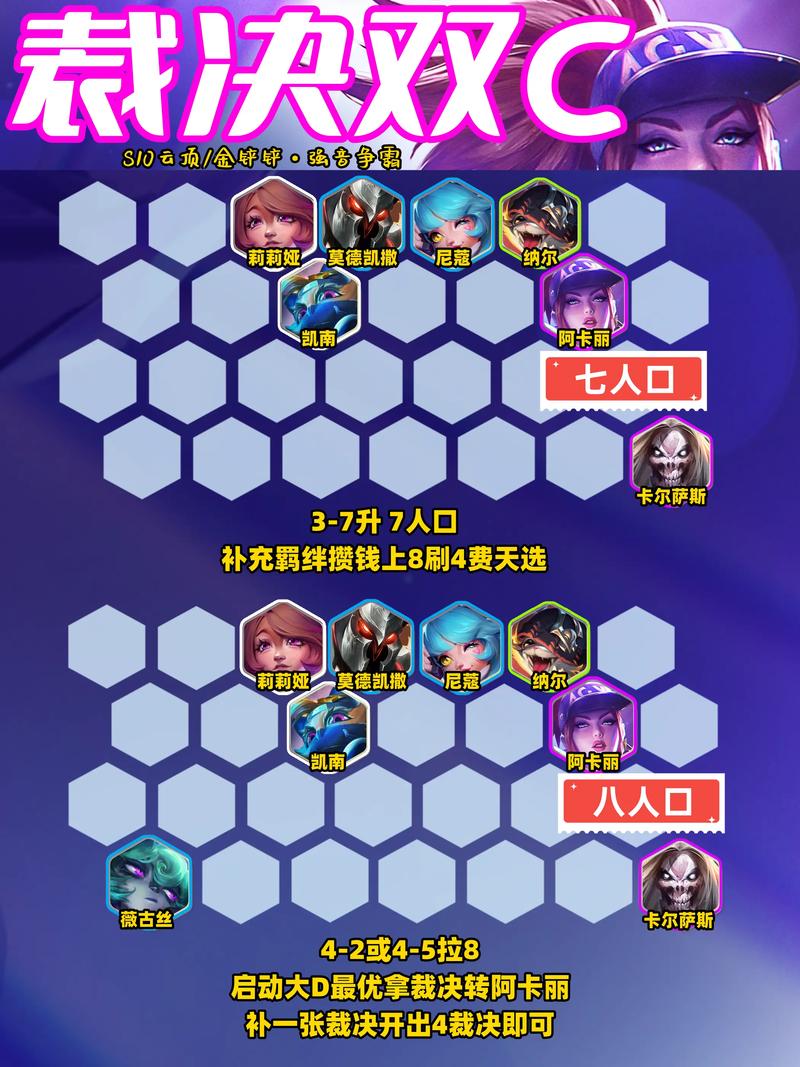 云顶之弈s10飞雷神裁决阿卡丽阵容玩法如下:阵容构成:核心英雄:阿卡丽(主C),凯南,莉莉娅,纳尔,铁男,妮蔻,死歌。9人口时优先上2星五费卡以提升阵容强度。羁绊效果:3五杀,4超粉,2裁决,3KDA,2秘护,2护卫。这些羁绊效果能够大幅提升阵容的整体战斗力和生存能力。