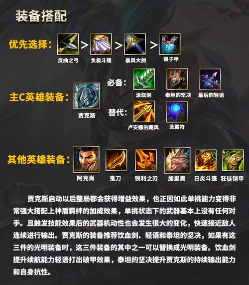 利用黑客跳后排:阵容核心是利用黑客的跳后排能力,将贾克斯直接带到后排,利用贾克斯的高输出能力快速消灭敌方后排输出。强化与装备选取:英雄强化:贾克斯的最佳强化是“无情连打”,其次是“躲闪”。海克斯强化:狩猎律动、星界赐福、DD街区、万用瞄准镜、黑客之徽、三费之力、黄金门票等。