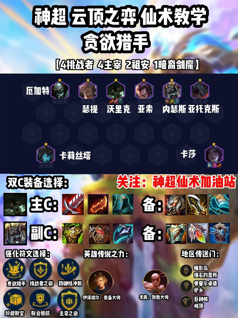 〖Four〗、阵容搭配 推荐阵容:德玛西亚之力、诺克萨斯之手、瑟提、暗裔剑魔、沃里克、内瑟斯、嘉文四世、娑娜,组成6主宰3德玛的羁绊。 这样的阵容可以充分利用主宰的羁绊效果,提升整体的输出和生存能力。 强化符文选取 优选:贪欲猎手。