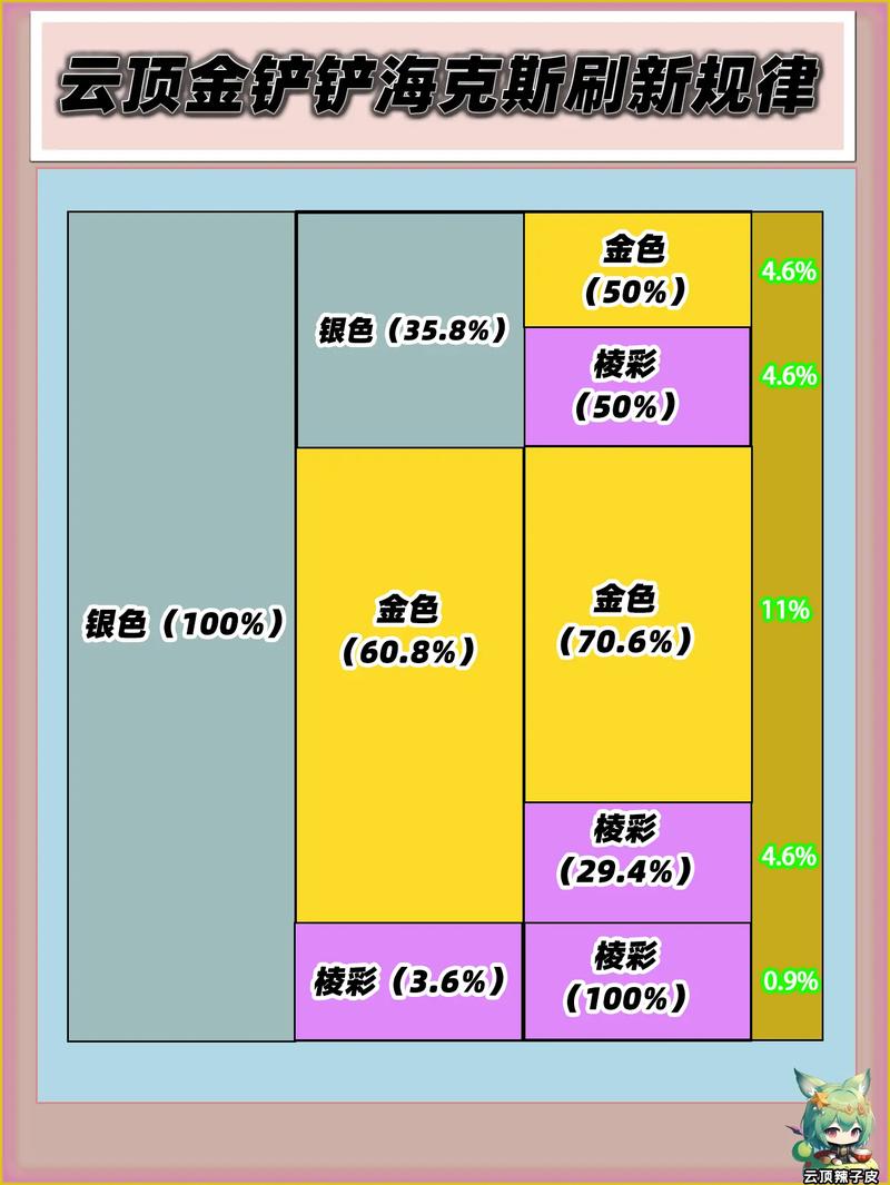〖Five〗、在金铲铲之战中,银银金的海克斯组合出现概率比较高,达到了30%,而彩彩彩则是最低,仅有1%的几率。通常来说,银色海克斯是最常见的,其次是金色,最后是彩色。具体各色海克斯的出现概率可以通过下图查看。从数据来看,海克斯颜色的出现遵循一定的规律。