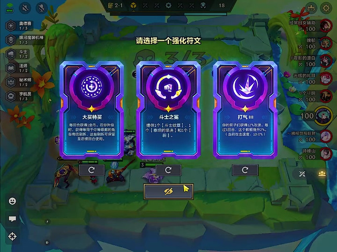 在金铲铲之战中,强化符文的选取应根据游戏阶段和阵容需求进行合理规划。以下是一套较为通用的强化符文选取策略:2-1阶段:优先选取经济类强化符文。这一阶段,经济发育至关重要,能够帮助玩家更快地积累金币,为后续的高费卡刷新和阵容成型打下基础。