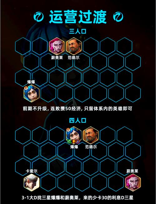 开局:选取“猛拍按钮”作为天赋,2阶段不升级,优先凑齐6堡垒和2赛博老大。中期:在3-1阶段搜点到30金币停手,确保3-2阶段自然升5级。追3星:在3-2阶段卡40~50金币利息,优先追3星波比,其次是维迦和俄洛伊/希瓦娜。波比到3星后,根据局势适时升级。