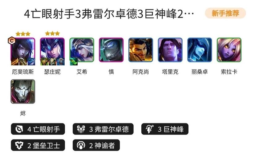 标准阵容- 成员:慎、锤石、阿木木、俄洛伊、厄斐琉斯、寒冰、辛德拉。在没有辛德拉和寒冰时,可以分别用千珏和赛娜替代。 羁绊与转职- 7人口完美闭环羁绊:如上所述的标准阵容。- 转职选取: - 狙神转职:8人口上赛娜,开4狙神。 - 护卫转职:8人口上泰坦/瑟提,开4护卫。