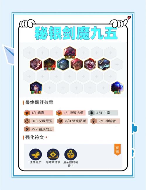 〖Three〗、前期:利用AI羁绊进行过渡,优先选取加血或掉钱的属性,以提升后期的战力。在选秀和野怪环节,尽量拿到剑魔所需的机甲转和斗士转装备。中期:使用武器或其他前排输出英雄,搭配剑魔的装备进行打工过渡。此时,需要确保阵容的前排坦度和后排输出能力,以稳定中期局势。