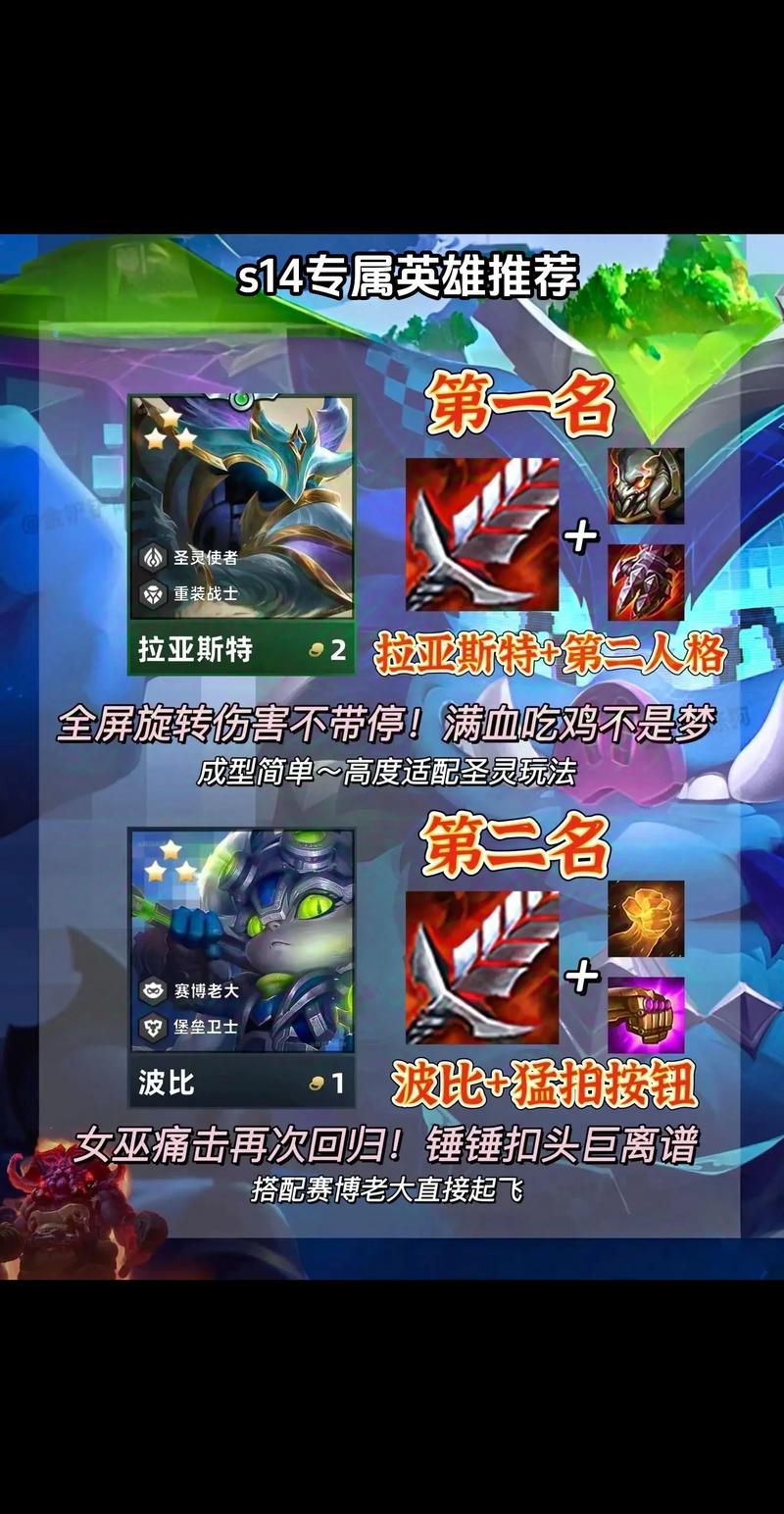 〖One〗、《金铲铲之战》S14英雄专属强化海克斯主要包括以下几种:猛拍按钮:效果:获得一个波比,并且你最强大的波比技能将被替换为3连重击。这个强化使得波比的攻击能力得到显著提升,能够在短时间内造成大量伤害。第二人格:效果:获得一个拉亚斯特,最强大的拉亚斯特将与天将凯隐相同,并且技能会替换为冲刺和1格旋转。